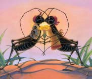 Exhibited at the Society of Illustrators Ponder this: “To illustrate this book I wanted to show a cricket’sworld. A small dandelion to us must seem as large as a tree to a cricket. To draw a bug’s-eye view I took photographsat ground level, I gathered twigs, pebbles and leaves and captured a cricket and named her Mini.” — Ponder Goembel More about crickets: see Links & Things |